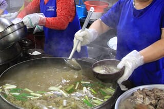 クッパプをトリョム(ごはんを盛った器にスープをかけてこぼすのを繰り返すこと)している様子。全羅南道羅州市中央洞「ハヤンチプ(하얀집)」にて2015年11月4日撮影。
