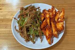 サムナムルムチム(ヤマブキショウマの和え物)とトドクムチム(ツルニンジンの和え物)の盛り合わせ。慶尚北道鬱陵郡北面羅里「ヌルプルン山荘食堂(늘푸른 산장식당)」にて2025年3月30日撮影。