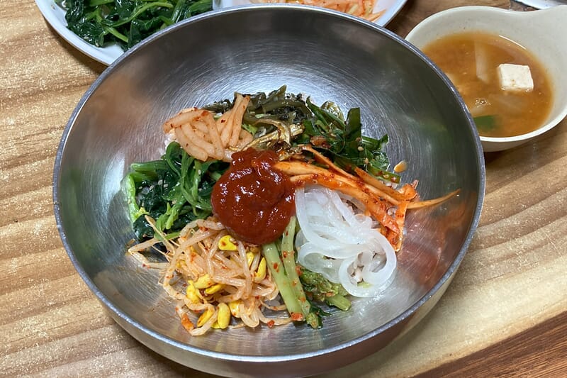 ポリパプに副菜を盛り付けたところ。忠清南道牙山市温泉洞「カマソッポリパプ(가마솥보리밥)」にて2025年5月25日撮影。