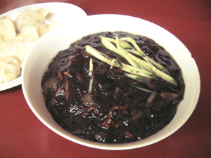 チャジャンミョンは麺に黒味噌をどろっとかけたもの。