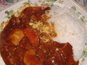 ごく普通の辛さだった家庭のカレーに、黄金の粉末をパラパラとふりかけます。