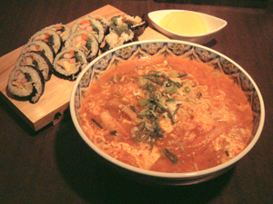 写真は明洞キンパプ(500円)とキムチラーメン(700円)。