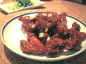 フライドチキンに韓国式の甘辛いタレをかけた料理です。