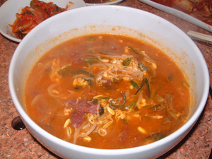 この日はユッケジャン(牛細切り肉と野菜の辛いスープ)を追加。