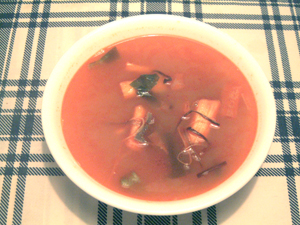 牛細切り肉をメインに、野菜をたっぷり入れた辛いスープです。