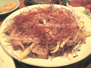 こちらは豚バラ肉にたっぷりのネギと糸唐辛子をからめたもの。