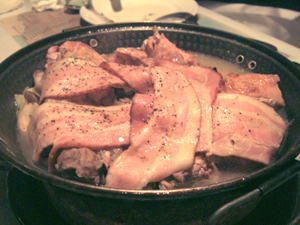 ベーコン、鶏モモ肉、スペアリブが豪快に煮込まれていました。