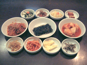 白菜キムチ、韓国海苔、カクトゥギ(大根の角切りキムチ)、