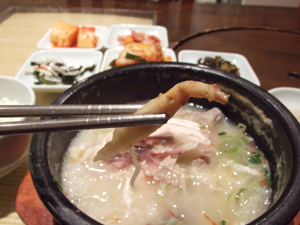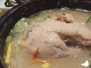 若鶏の腹に朝鮮人参、もち米、ナツメ、栗などを詰めて煮た料理。