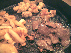 鉄板で焼いていくとコプチャンからすごい量の脂がにじみ出て、