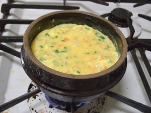 コンブでとったダシと卵を混ぜ、具を入れて火にかけるだけです。