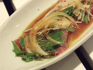 まずは上の写真、水菜、タマネギを加えた牛たたきに始まり、