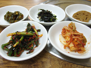 左下の皿、細ネギのキムチでごはんを巻いて食べると美味です。