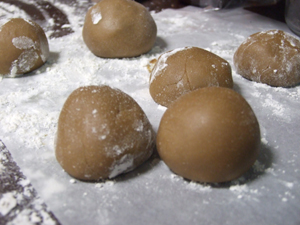 粉まみれのテーブルに茶色くつやつやしたダンゴ。