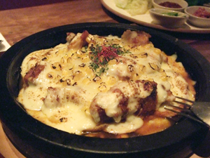 激辛に味付けた鶏肉を焼き、チーズを乗せたチーズプルタク