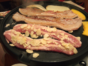 冒頭の写真は、ノーマルなサムギョプサル(豚バラ肉の焼肉)と、