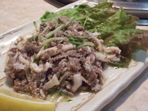 冒頭の写真、ユッケなどを前菜がわりに注文しつつ、