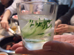 酒は韓国焼酎にキュウリの千切りを入れたオイソジュ。