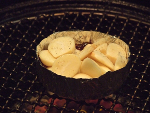 金網の上ではゴマ油に浸したニンニクが煮られています。
