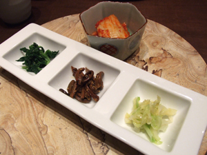 ホウレンソウ、ゼンマイ、キャベツを使った3種類のナムルと、