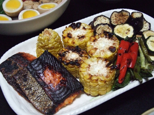 手前に鮭がおりますが、あとはトウモロコシにナス、