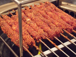 串に指した羊肉を、専用の焼き台で焼いて食べます。
