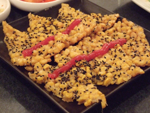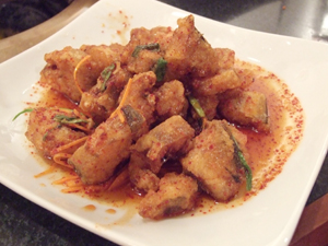 揚げたマダラを甘辛いタレと絡めています。