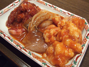 内容的にはホルモン類をピリ辛のタレで炒め煮した料理。