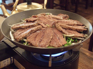 茹でた牛ほほ肉を薄切りにしたスユク。