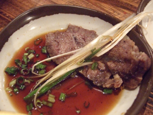 肉の下に敷いてあるネギと一緒に酢醤油につけて。