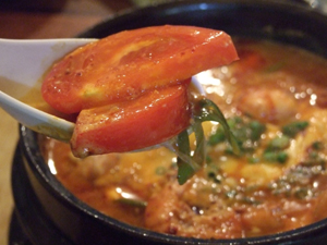 スライスチーズとトマトを入れたイタリア風のスンドゥブチゲ。