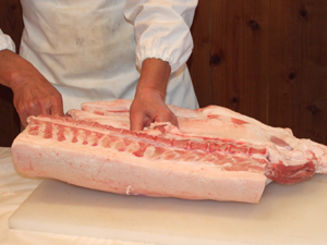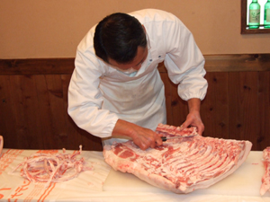 大まかに3つに分けられた豚を小型のナイフで解体。