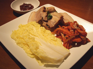 定番格の白菜で茹で豚を包んで食べるポッサム。
