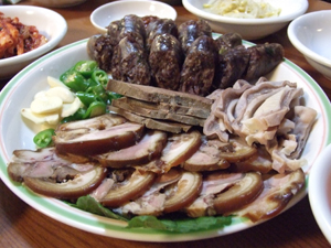 中央にあるのはスンデに付き物の豚レバーとガツ(豚の胃)。