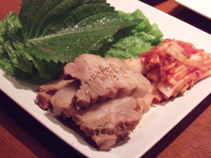 サンチュ、エゴマの葉で包むポッサム(茹で豚)。