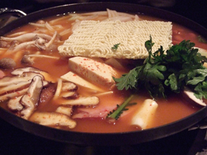 ランチョンミートやソーセージの入った洋テイストの韓国鍋です。