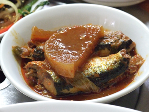 サンマと大根をピリ辛に煮込んだコンチチョリムです。