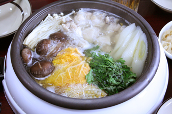 メインには鶏肉の鍋。黄色い白菜が目を引きました。