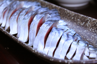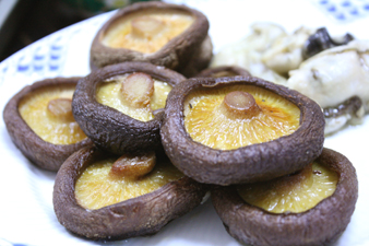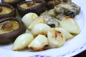 オリーブオイルで焼き上げた肉厚なシイタケ。後ろは牡蠣。