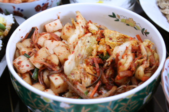 右が白菜キムチで、左がカクトゥギ(大根の角切りキムチ)。