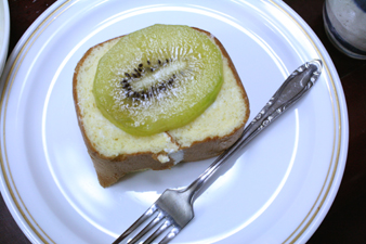最後にデザートもう1品。厚く切ったロールケーキにスライスキウイ。