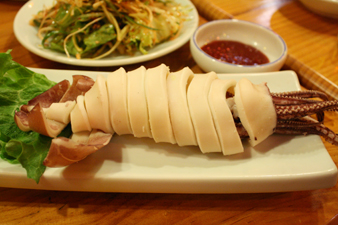 その次が茹でイカ。チョジャン(酢コチュジャン)つけて食べます。