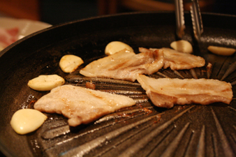 定番メニューからサムギョプサル(豚バラ肉の焼肉)。