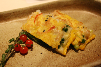 こちらがサムゲタンコースにつく海鮮チヂミで……。