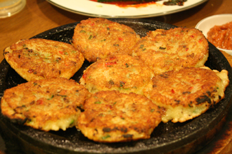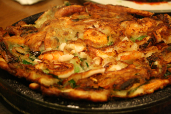 海鮮チヂミはイカゲソのほかにエビなどもたっぷり。