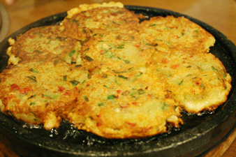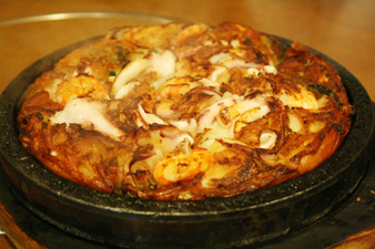 エビ、イカどっさりで、生地に特有の甘味がある海鮮チヂミ。