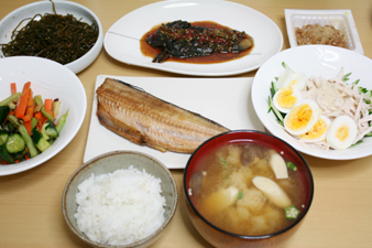 ごはん、味噌汁、ホッケ焼き、ボイルした鶏胸肉とキュウリのサラダ、