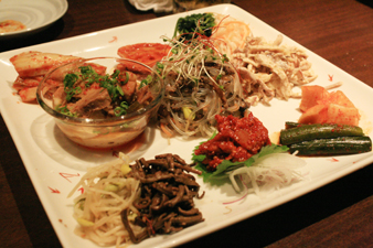 キムチ、ナムル、チャプチェ(春雨炒め)などが乗っています。