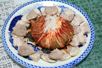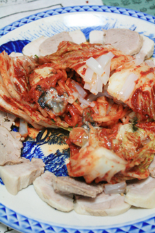 白菜の外葉で具を包み込んだポッサムキムチ。
