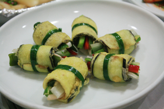 ナスのジョン(衣焼き)で細切りの野菜や錦糸卵を巻いたもの。